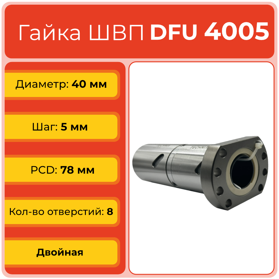 Гайка ШВП DFU4005 TECHNIX — это высокоточная двойная гайка с диаметром 40 мм и шагом резьбы 5 мм. Конструкция типа DFU (Double-nut Fixed Unit) обеспечивает надёжную фиксацию и предварительный натяг, что позволяет полностью исключить люфт и добиться высокой осевой жёсткости. Эта удлинённая гайка шарико-винтовой передачи разработана для применения в сложных промышленных условиях, где особенно важны точность, стабильность и надёжность передачи усилий.
