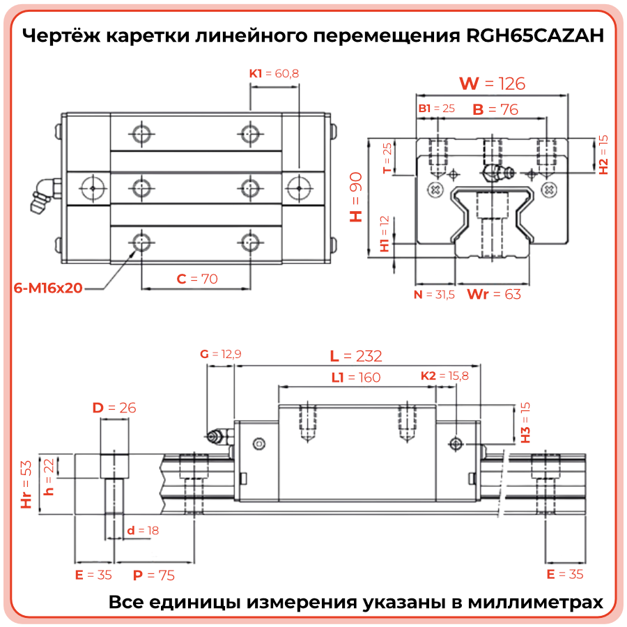 Ширина направляющей 65 мм. Подходит для применения в портальных станках, тяжёлых автоматизированных узлах, производственных линиях. Имеет высокую жёсткость, маслёнку и торцевые уплотнители.