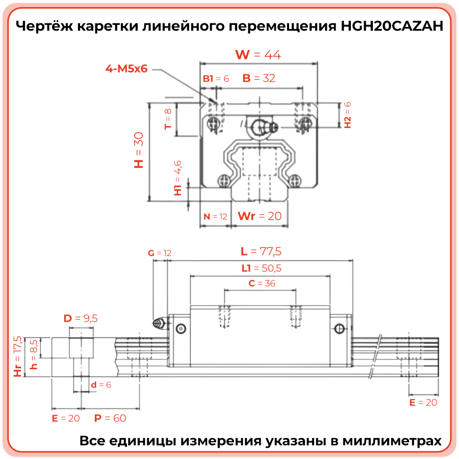 Линейная каретка HGH20CAZAH TECHNIX — высокий блок направляющей для промышленных систем