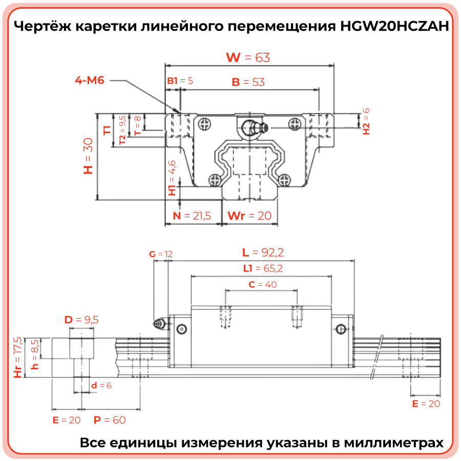 Линейная каретка HGW20HCZAH TECHNIX — широкий блок направляющей для промышленных систем