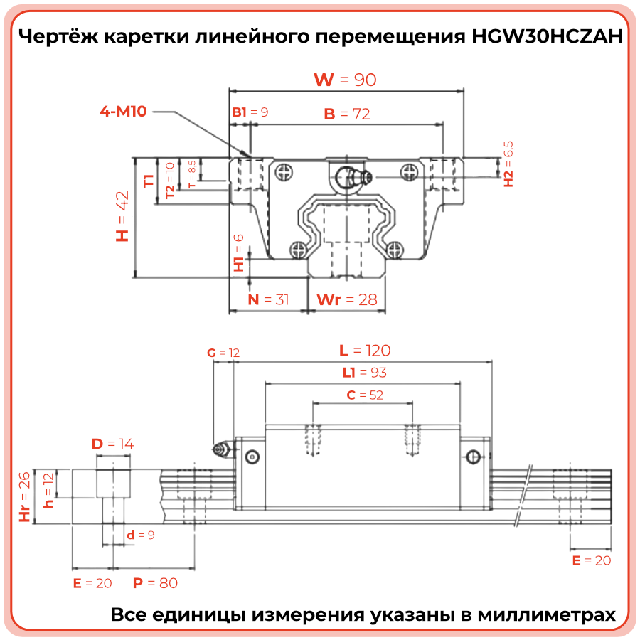 Линейная каретка HGW30HCZAH TECHNIX — широкий блок направляющей для промышленных систем