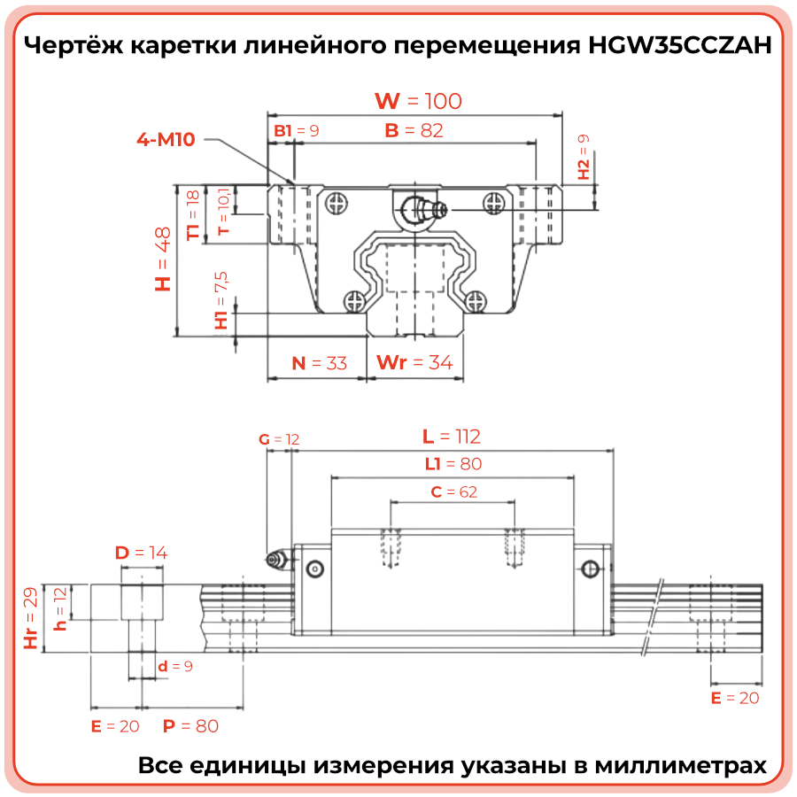 Линейная каретка HGW35CCZAH TECHNIX — широкий блок направляющей для промышленных систем