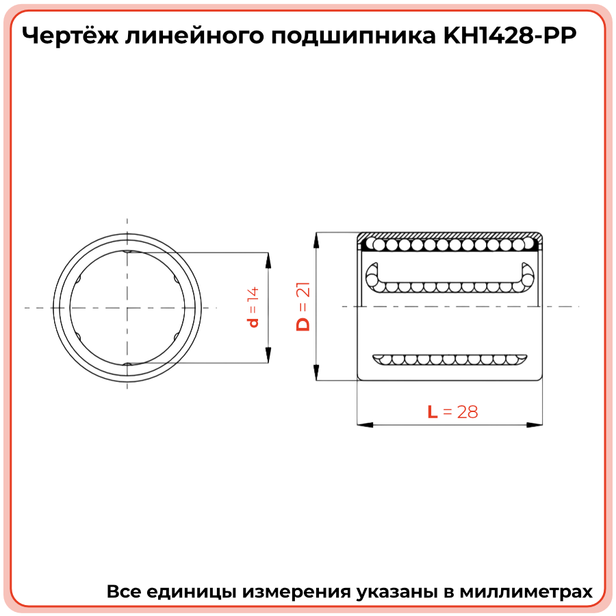 KH — серия компактных бесфланцевых линейных подшипников; 14 — внутренний диаметр (вал Ø14 мм); 28 — длина корпуса (28 мм); PP — два полимерных уплотнения (по одному с каждого торца).