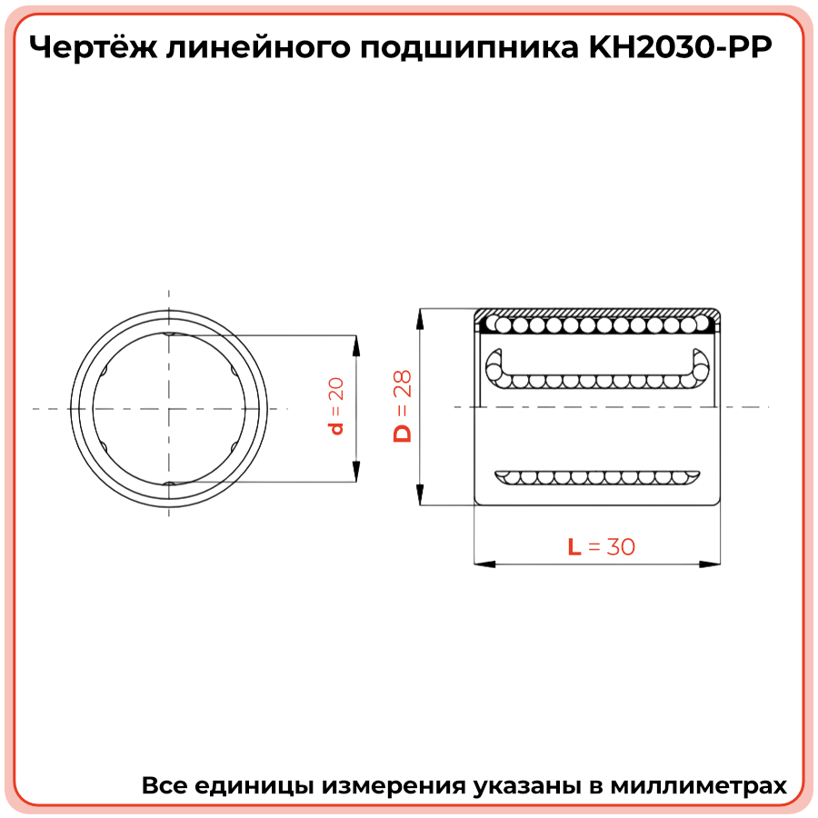 KH — серия компактных бесфланцевых линейных подшипников; 20 — внутренний диаметр (вал Ø20 мм); 30 — длина корпуса (30 мм); PP — два полимерных уплотнения (по одному с каждого торца).
