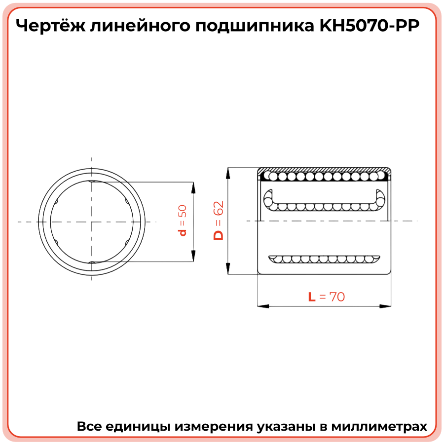 KH — серия компактных бесфланцевых линейных подшипников; 50 — внутренний диаметр (вал Ø50 мм); 70 — длина корпуса (70 мм); PP — два полимерных уплотнения (по одному с каждого торца).