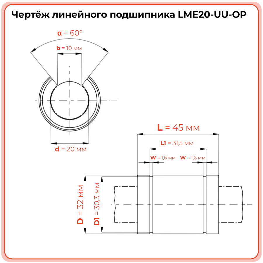 Поводами для замены служат: ощутимый радиальный люфт, вибрация и шум при движении, затруднённый или неравномерный ход. Рекомендуемый интервал плановой замены - 800–1200 часов наработки. Интервал сокращается при работе в условиях загрязнения и повышенных нагрузок. - Чем LME20-UU-OP отличается от LME20-UU (закрытый тип)?