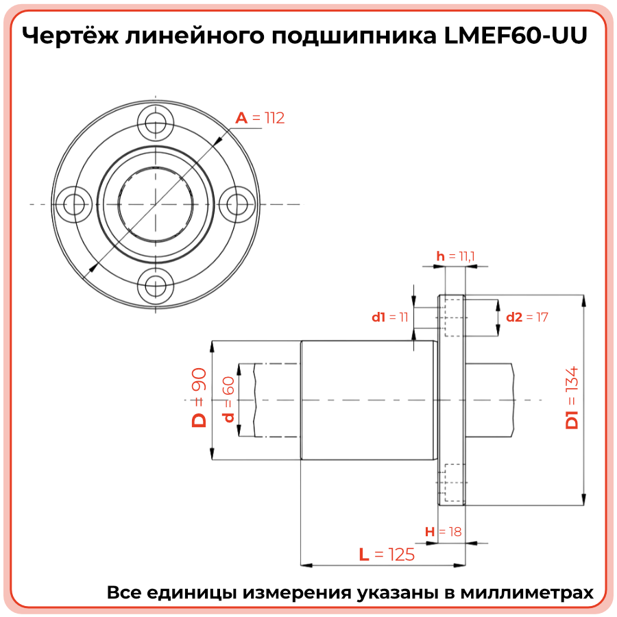 Подшипник LMEF60-UU — изделие максимального типоразмера серии, предназначенное для опорных и направляющих узлов тяжёлого промышленного оборудования с валами ∅60 мм. Применяется там, где компактная замена корпусным конструкциям недопустима, а требуется прямое фланцевое крепление с высокой несущей способностью.