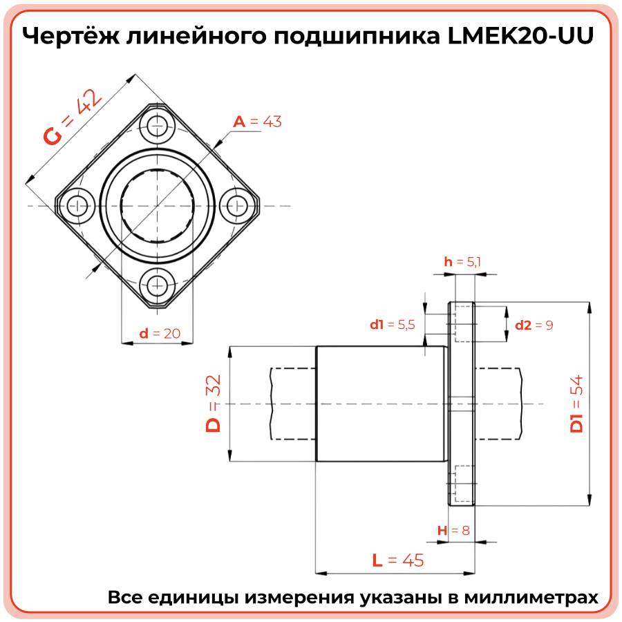 Подшипник работает по принципу рециркуляции шариков в 5 замкнутых дорожках качения. Динамическая грузоподъёмность составляет 860 Н, статическая — 1370 Н. Двустороннее резиновое уплотнение (UU) надёжно защищает рабочую зону от пыли, стружки и влаги. Рабочий диапазон температур: от −20°C до +80°C. Внутренний диаметр: 20 мм, наружный: 32 мм, длина: 45 мм. Толщина крепёжной площадки фланца: 8 мм, внешний диаметр площадки: 54 мм. Смазка — пластичная, закладывается при монтаже.