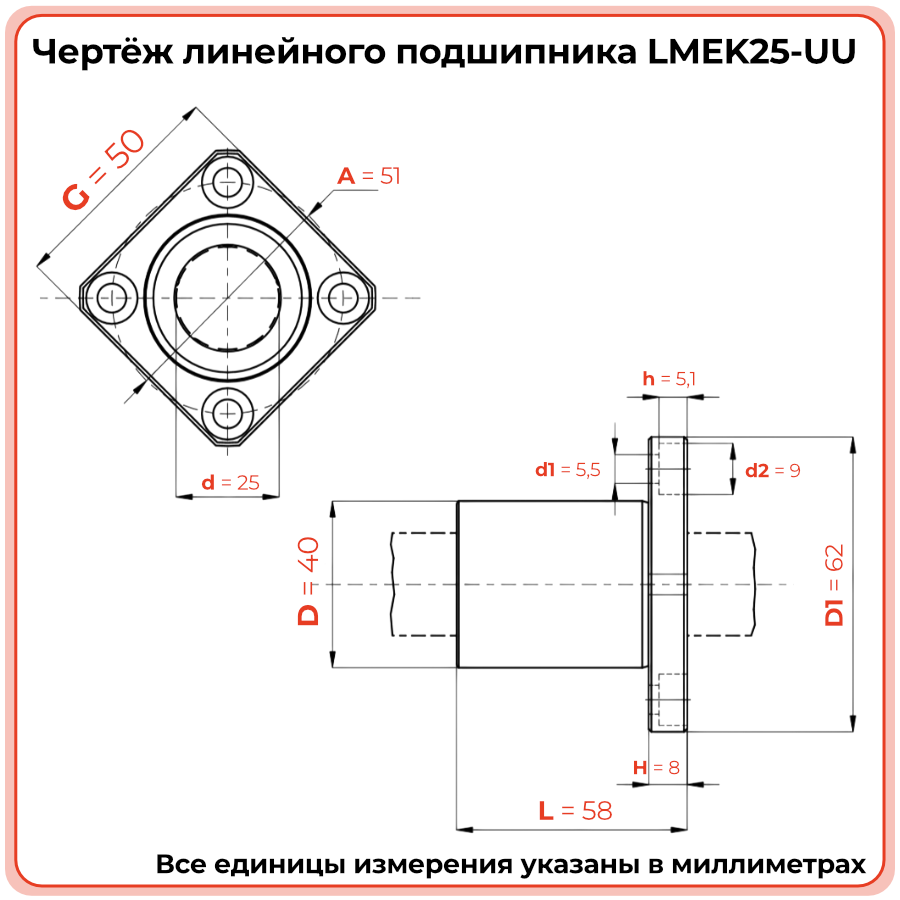 Линейный фланцевый подшипник LMEK25-UU с двусторонним уплотнением для вала ∅25 мм. Применяется в прецизионных системах подачи, фрезерных станках и координатно-измерительных машинах.