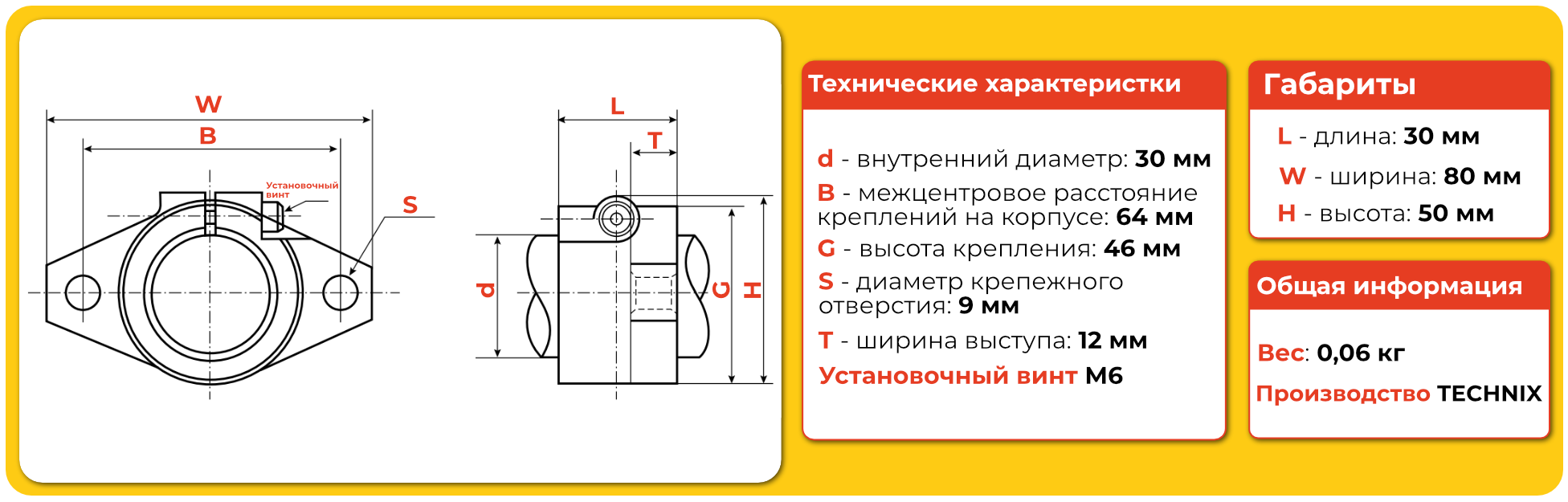Опора SHF30TECHNIX представляет собой корпус из дюралюминия с центральным цилиндрическим отверстием под вал 30 мм и фланцем с двумя крепёжными площадками. Конструкция обеспечивает жёсткое крепление опоры к базовой поверхности и надёжную прижимную фиксацию вала установочным винтом, уменьшая прогиб и вибрации при работе механизма.