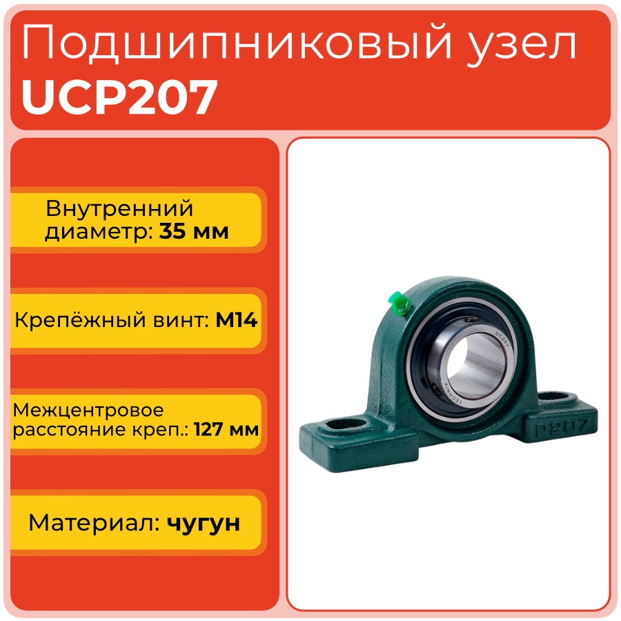 Подшипниковый узел UCP207 TECHNIX — корпусной узел на лапах с корпусным подшипником UC207 для вала 35 мм. Чугунный корпус P207 обеспечивает восприятие высоких радиальных нагрузок до 25 кН и надежное крепление на плоские опорные поверхности с возможностью компенсации перекоса вала до 2 градусов.