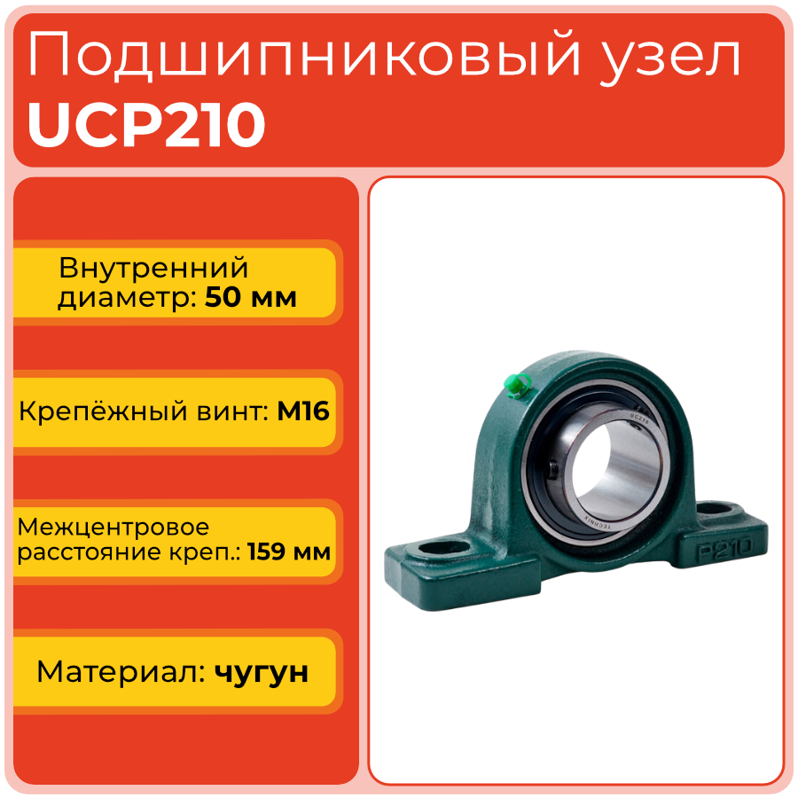 Узел состоит из чугунного корпуса P210 с двумя крепежными отверстиями под болты М16 и корпусного подшипника UC210 с расширенным внутренним кольцом и установочными винтами М8. Встроенный смазочный ниппель прямого типа под углом 45 градусов и двусторонние уплотнения со скребком обеспечивают защиту подшипника от пыли, влаги и длительное смазывание при работе в условиях высоконагруженных механизмов.