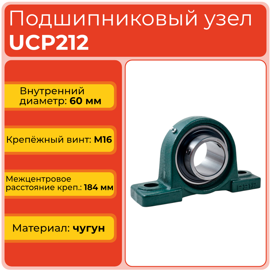 Узел состоит из массивного чугунного корпуса P212 с двумя крепежными отверстиями под болты М16 и корпусного подшипника UC212 с широким внутренним кольцом и стопорными винтами. Встроенный смазочный ниппель прямого типа и двусторонняя защитная система с резиновыми уплотнениями обеспечивают надежную защиту от пыли, грязи и влаги в условиях запыленных производственных помещений и горнодобывающих работ.