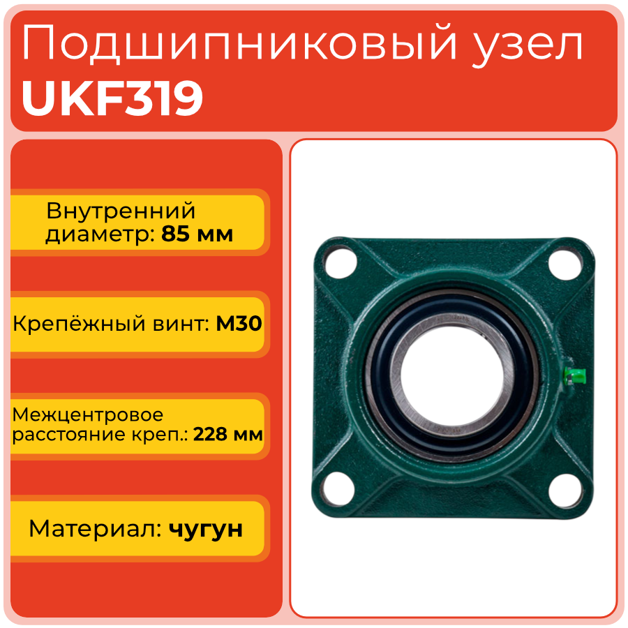 Узел UKF319 состоит из квадратного фланцевого корпуса с четырьмя отверстиями для крепления к конструкциям и основаниям промышленного оборудования. Корпусный подшипник UK с коническим внутренним отверстием устанавливается через закрепительную втулку, обеспечивая высокую точность центрирования на валу и стабильное распределение нагрузок при работе в автоматических системах.