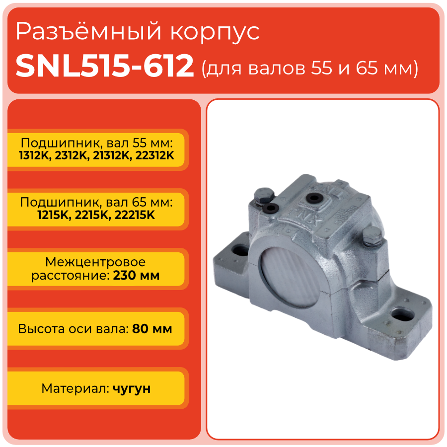 Разъемный корпус SNL515-612 – высокопрочный чугунный подшипниковый корпус стационарного типа с разъемной конструкцией для валов диаметром 65 мм. Обеспечивает надежную фиксацию и защиту самоустанавливающихся шарико- и роликоподшипников в промышленном оборудовании.