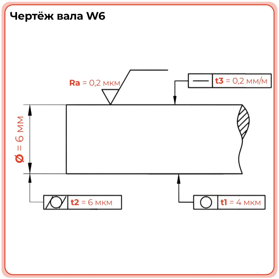 Прецизионный вал W6 TECHNIX без опоры предназначен для лёгких и сверхкомпактных систем линейного перемещения. Диаметр 6 мм делает его оптимальным выбором для настольного, лабораторного и малогабаритного оборудования, где важны минимальные габариты и высокая точность хода.